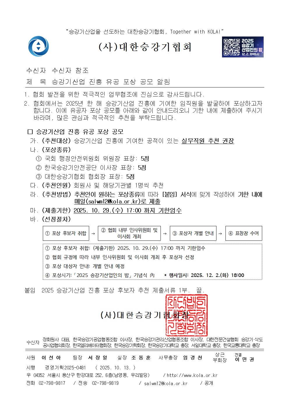 2. 협회에서는 2025년 한 해 승강기산업 진흥에 기여한 임직원을 발굴하여 포상하고자 합니다.