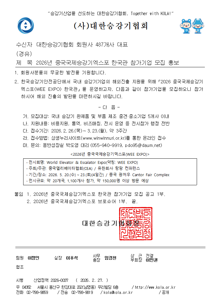 「2026 중국국제승강기엑스포(WEE EXPO) 한국관」을 운영하고자,