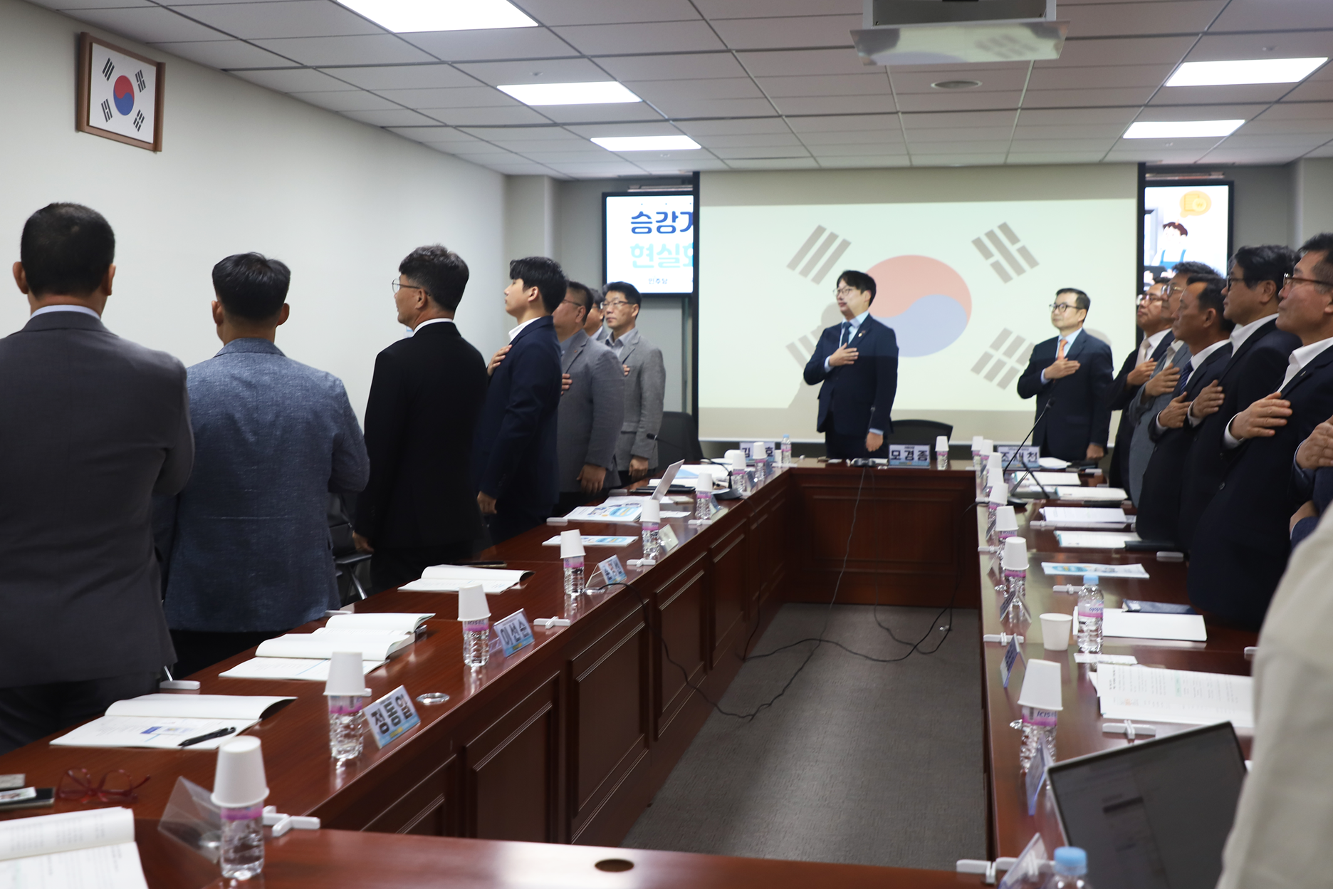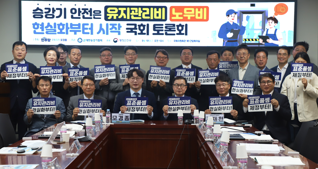 [앞줄] 좌측부터 한국승강기관리산업협동조합 이선순 전무, 한국승강기대학교 김승호 부총장, 더불어민주당 모경종 국회의원(인천 서구병), 대한승강기협회 조재천 회장, 한국승강기공업협동조합 손영선 이사장, 대한승강기협회 이민권 상근부회장