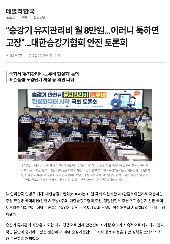 대한승강기협회(KOLA)는 19일 국회 의원회관 제1간담회의실에서 더불어민주당 모경종 국회의원(인천 서구병) 주최, 대한승강기협회 주관, 행정안전부 후원으로 승강기 안전 국회 토론회를 개최했다. 이날 토론회는 ‘승강기 안전은 유지관리비·노무비 현실화부터 시작’이라는 주제로 진행됐다.
