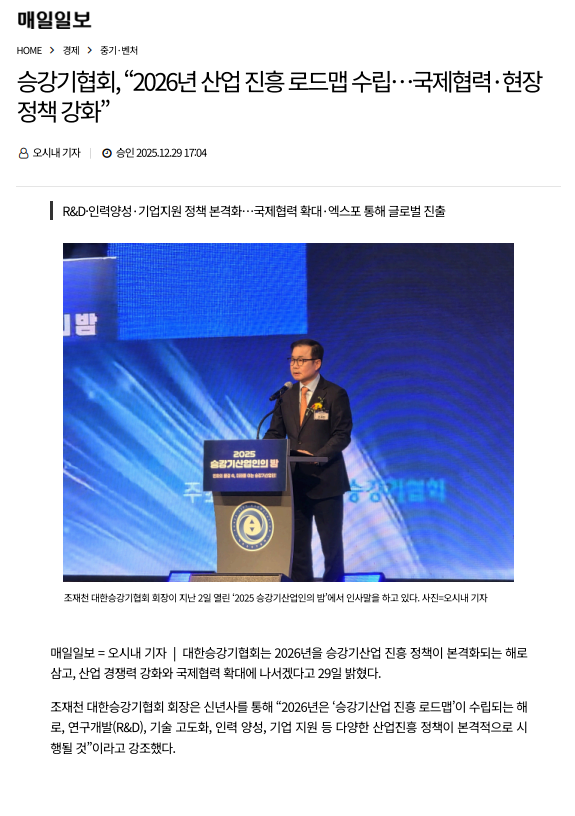 조재천 대한승강기협회 회장은 신년사를 통해 “2026년은 ‘승강기산업 진흥 로드맵’이 수립되는 해로, 연구개발(R&D), 기술 고도화, 인력 양성, 기업 지원 등 다양한 산업진흥 정책이 본격적으로 시행될 것”이라고 강조했다.