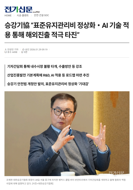 대한승강기협회(회장 조재천)는 1월 28일 서울 중구에 위치한 뱅커스 클럽 바이 반얀트리에서 기자간담회를 개최하고 해외 시장 진출로 내수시장의 어려움을 극복해야 한다고 강조했다. 이를 위해 승강기 기술에 인공지능(AI)을 결합시킬 수 있도록 정부 차원의 테스트베드 및 R&D 지원이 필요하며 표준유지관리비를 정상화할 수 있는 제도적 지원이 동반돼야 한다고 밝혔다.